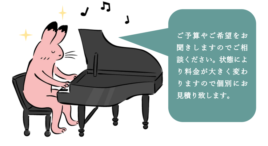 「新居にお引越し」「リフォームの機会に」「ピアノを譲りたい」。そのような時はピアノクリーニングがおすすめです。特に長年調律していないピアノは移動先で修理代が発生してしまうことも・・。せっかく嬉しい気持ちで譲り受けたピアノ。悲しい事にならないように一度お預かりし、外装から内装までピカピカに磨き上げます。ピアノの状態はそれぞれすべて違うため、可能な限りピアノを前にお見積り致します。